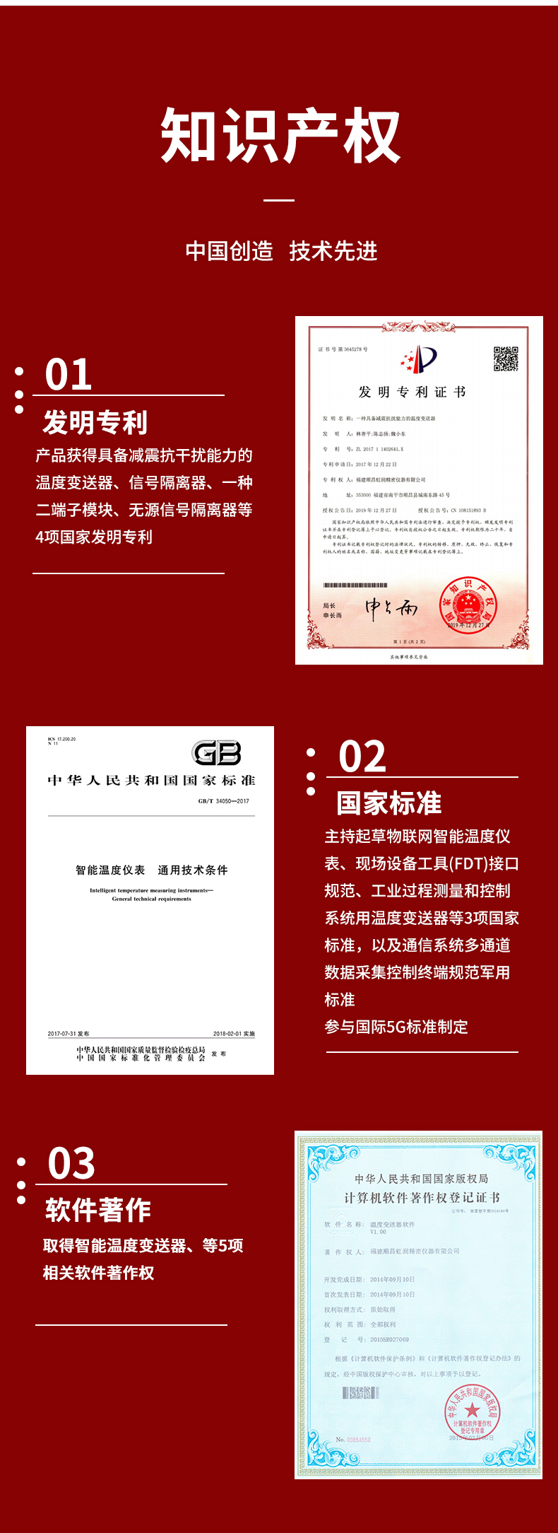 虹潤公司是專業生產溫度變送器的國家專精特新“小巨人”企業。生產的智能溫度變送器,具有適配各類溫度傳感器,精度高,穩定性好,通過編程線修改輸入信號類型及量程,高抗干擾等特點。該產品不僅通過HART基金會認證、德國萊茵 CE 認證與 SIL 功能安全認證,還獲得具備減震抗干擾能力的溫度變送器、信號隔離器、一種二端子模塊、無源信號隔離器等4項國家發明專利,主持起草物聯網智能溫度儀表、現場設備工具(FDT)接口規范、工業過程測量和控制系統用溫度變送器等3項國家標準,以及通信系統多通道數據采集控制終端規范軍用標準,參與國際5G標準制定,取得智能溫度變送器、HART溫度變送器等3項相關軟件著作權。產品廣泛應用于石油、化工、電力、冶金、制藥、食品、水處理等各種工業領域。
